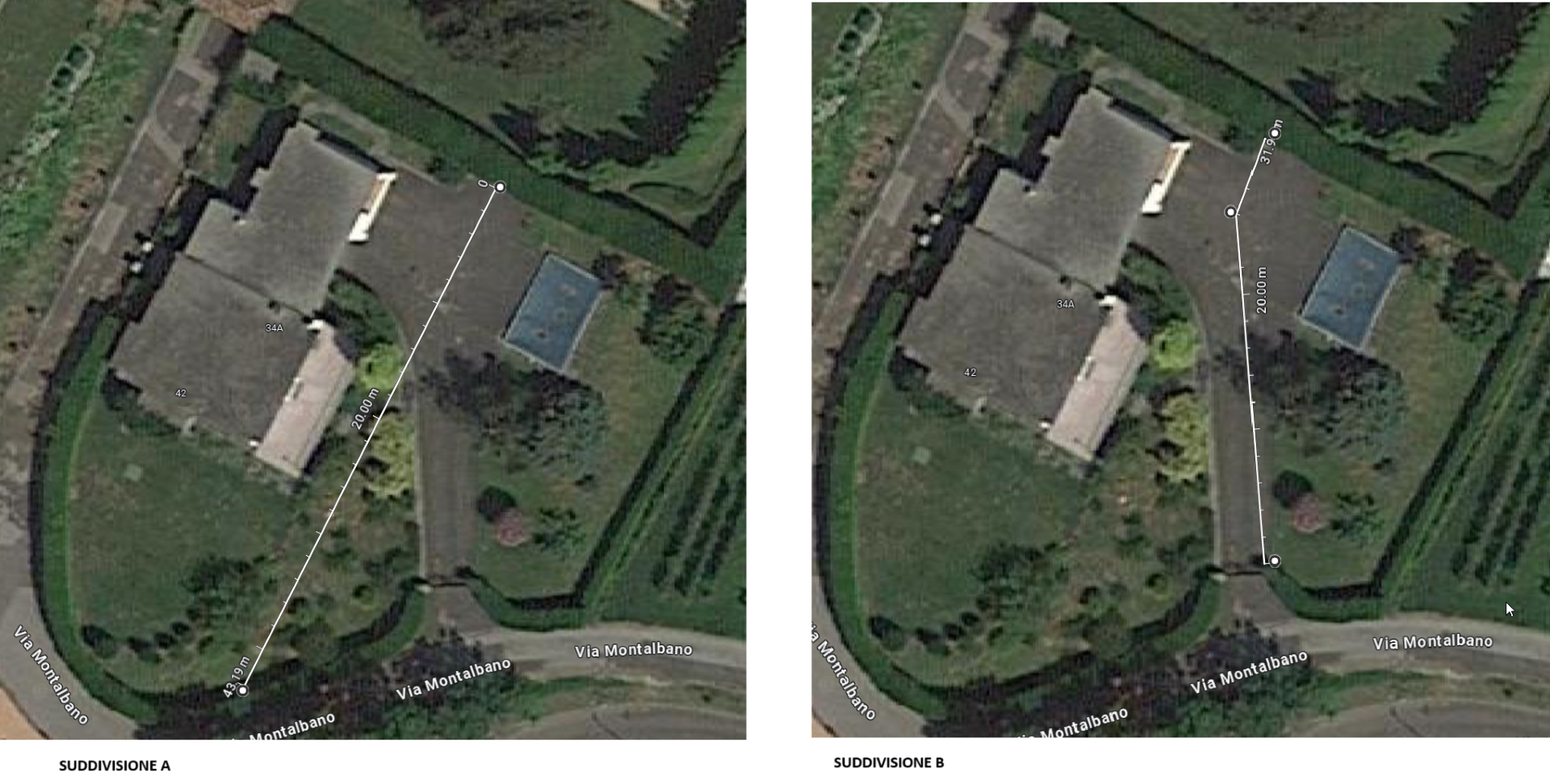 La parcella é frutto di un progetto di scorporo da un terreno eccedente in esubero di una villa. Vi sono diverse possibilità di frazionamento, che comunque non cambieranno la sostanza, ma che prevedono due diverse misure per il nuovo lotto in formazione : la prima ipotesi realizza una parcella di 705 Mq, mentre l'altra di 630 Mq.